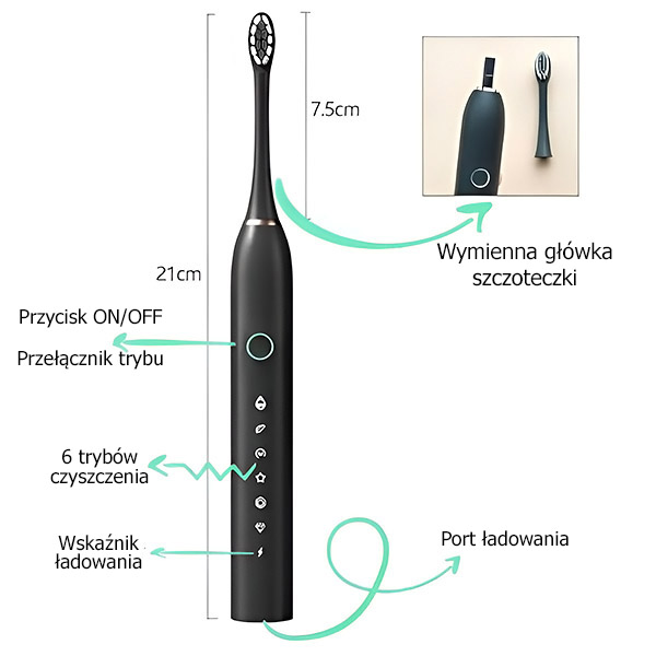 🦷 Możliwość dokupienia wymiennych końcówek, dla dłuższej trwałości i pełnej higieny!
