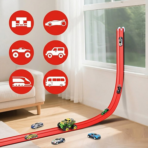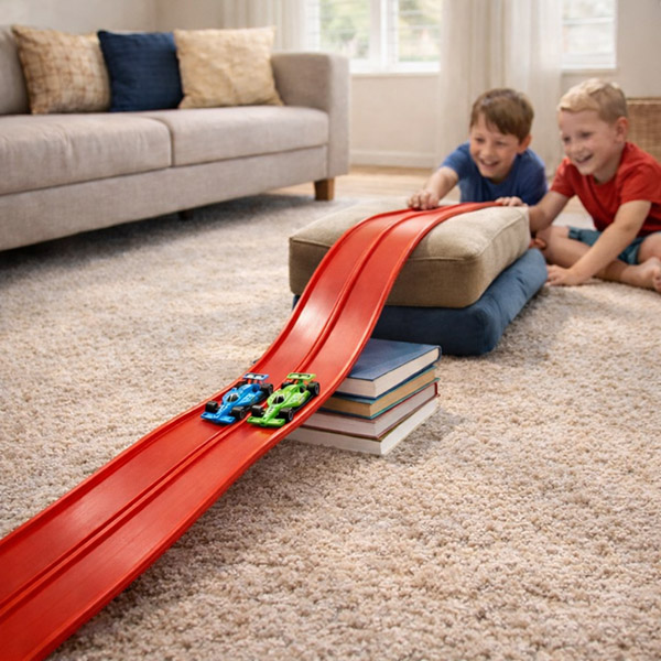 Dzieci mogą kształtować tor, wykorzystując codzienne przedmioty do tworzenia skoków, tuneli i pętli, co pobudza wyobraźnię i umiejętność rozwiązywania problemów zamiast powtarzalnej zabawy. Utrzymuje dzieci skupione przez wiele godzin bez ekranów.